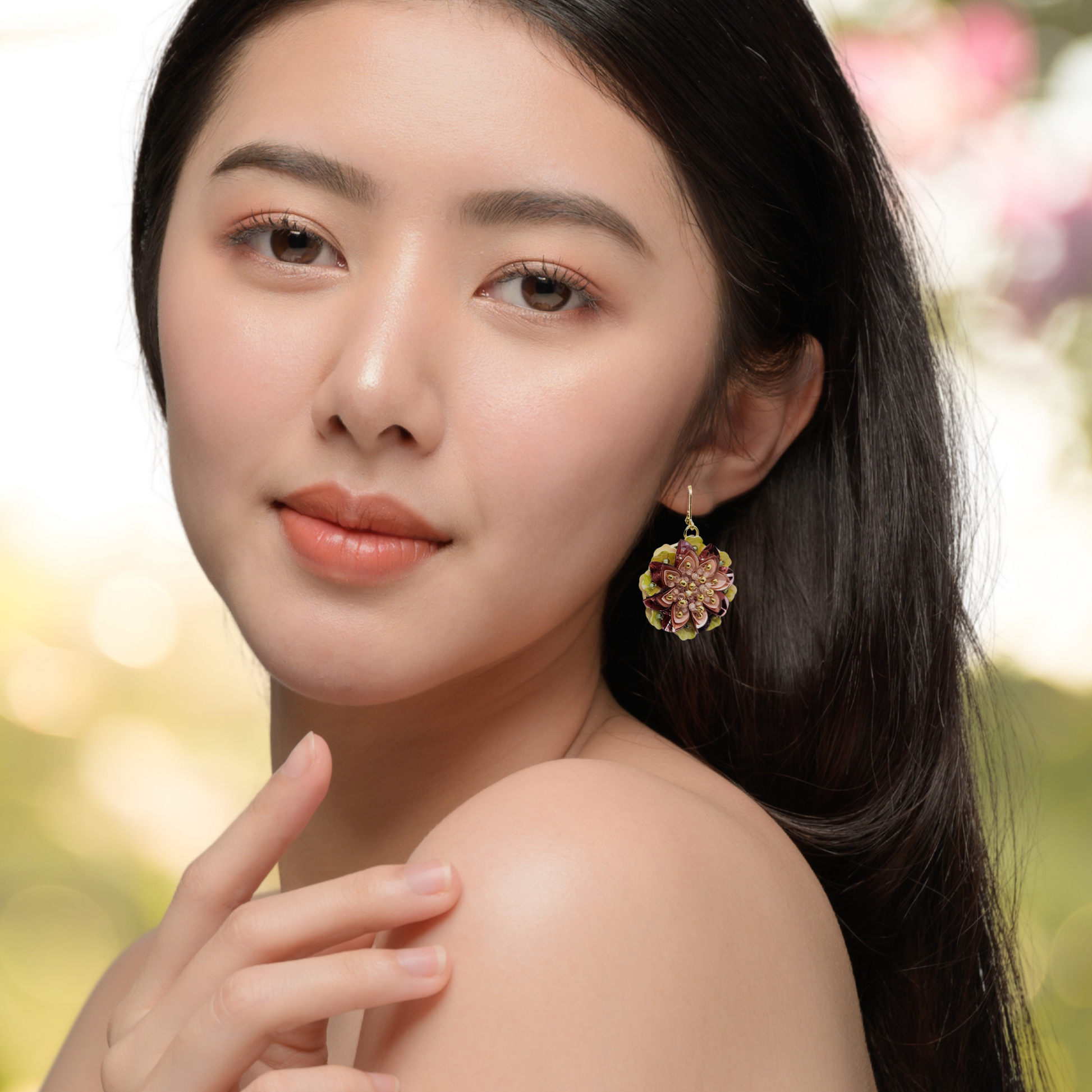 Bold and ultra feminine. A single flower with layers of petals offsets a detailed beaded centre, complimented by a splash of green.