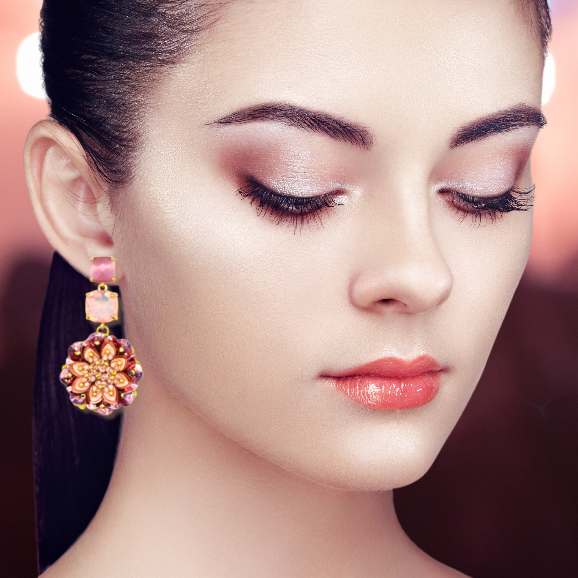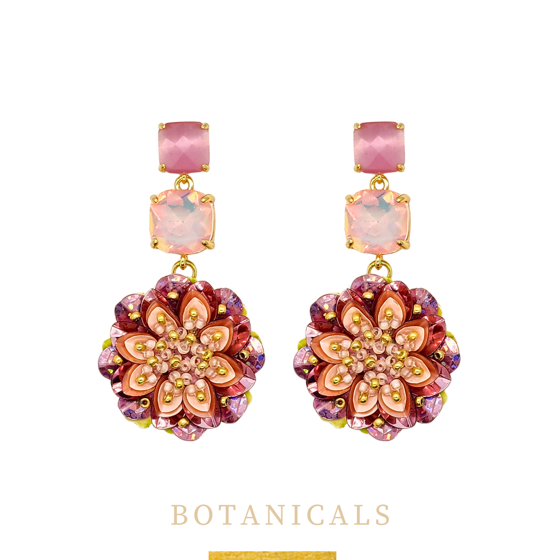 The light weight earrings feature a glass faceted gem stud and glass gem connector. Findings are gold plated brass settings with a gold plated silver ear post.