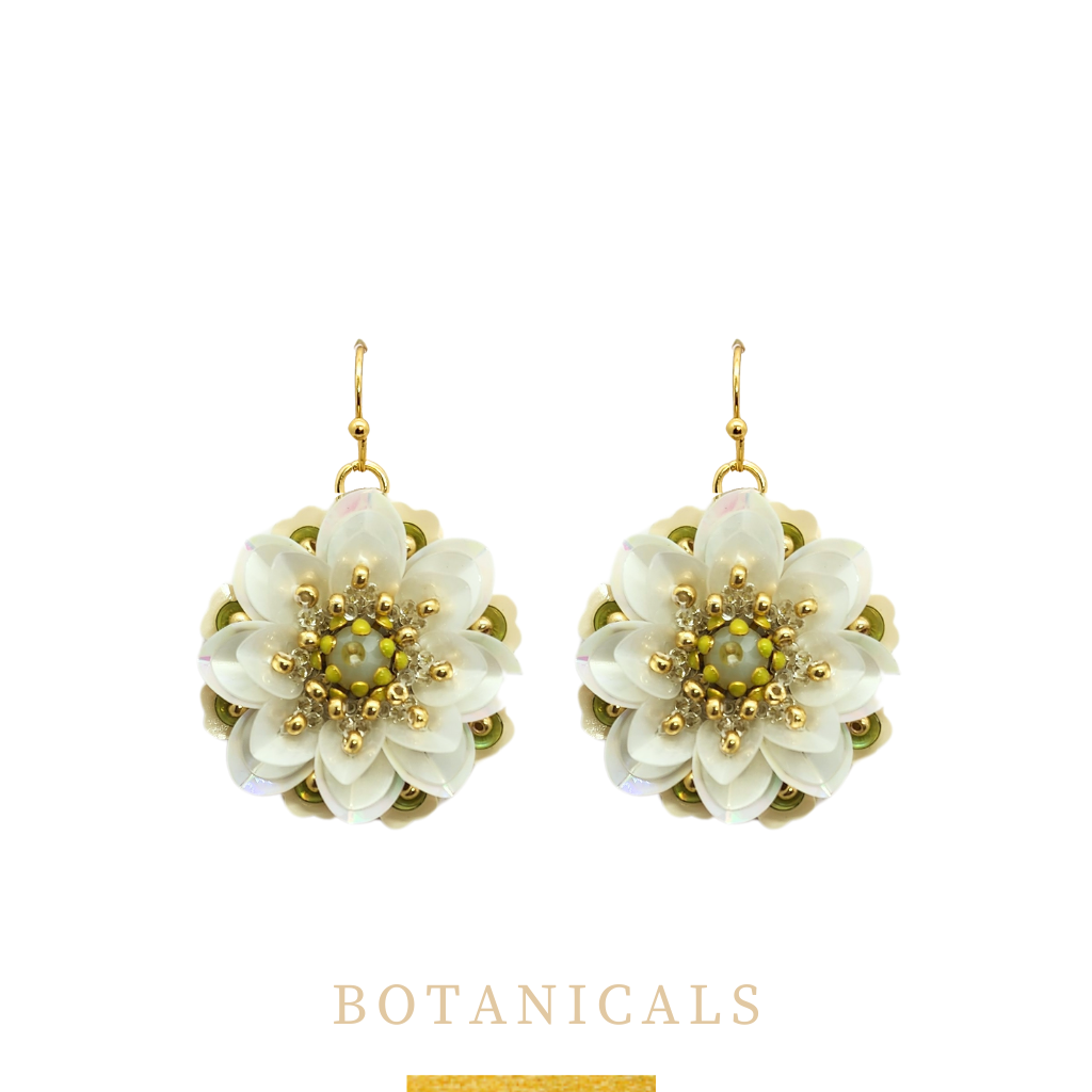 A single flower with layers of petals, offsets delicate bead and brass stamens.