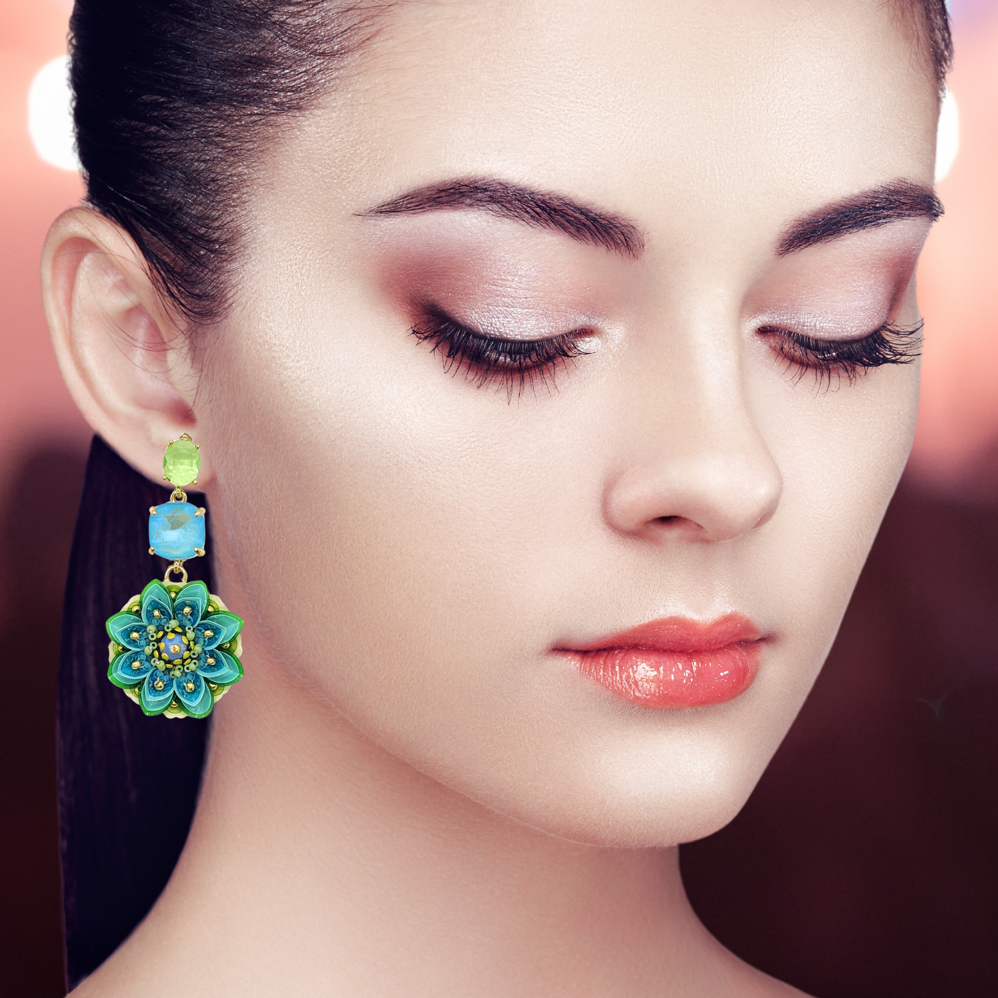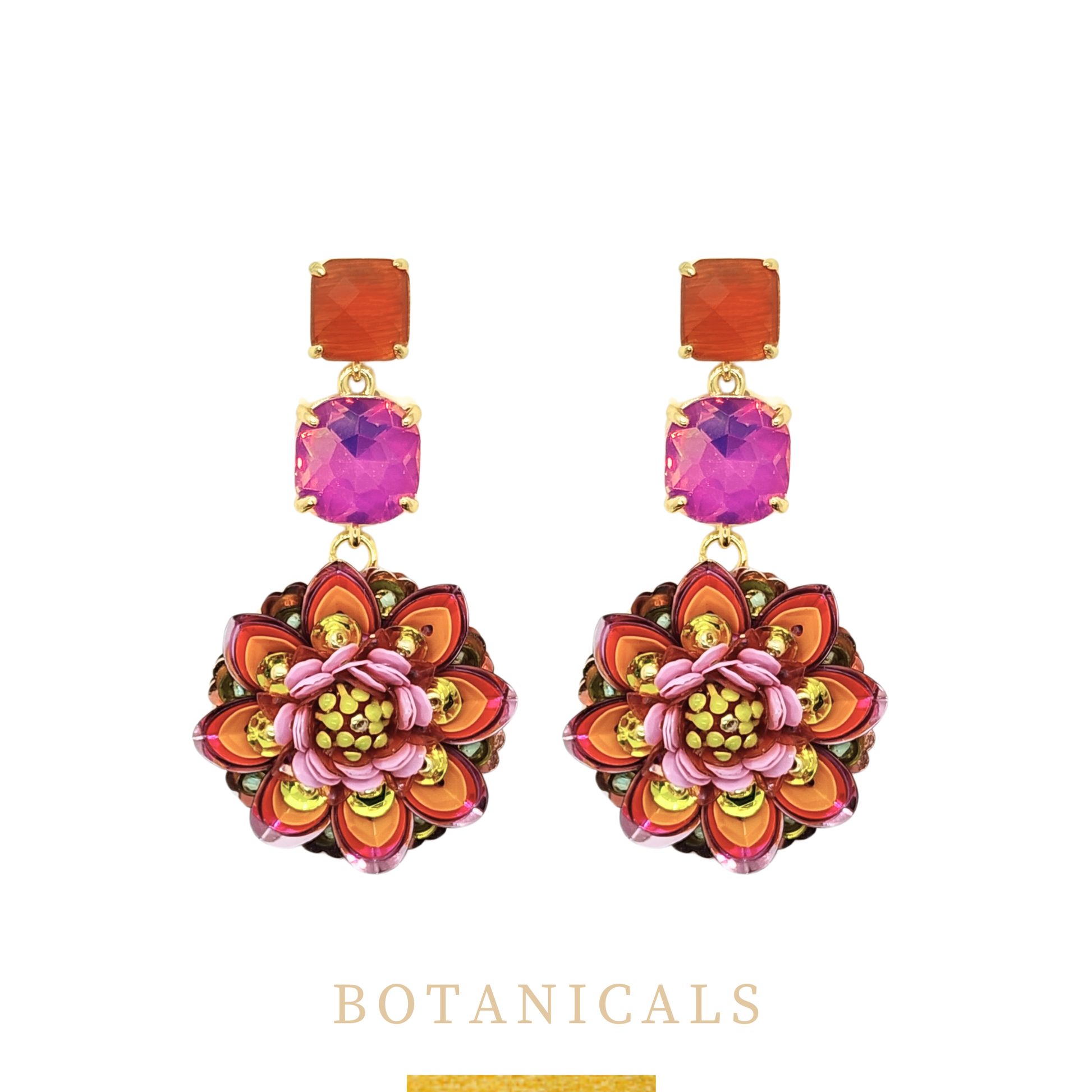 The light weight earrings feature a glass faceted gem stud and glass gem connector. Findings are gold plated brass settings with a gold plated silver ear post.